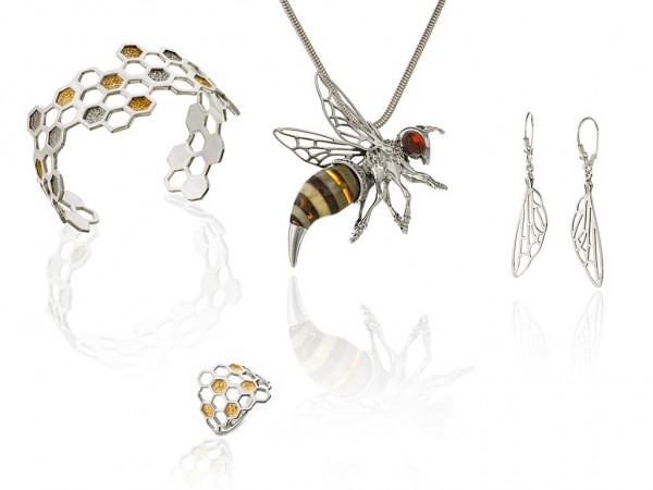 Unikatowy, ręcznie robiony komplet będący świetnym uzupełnieniem pierścionka "Pszczoła". Wykonany z pozłacanego miejscami srebra (plastry miodu) i klejonego, naturalnego bursztynu.
