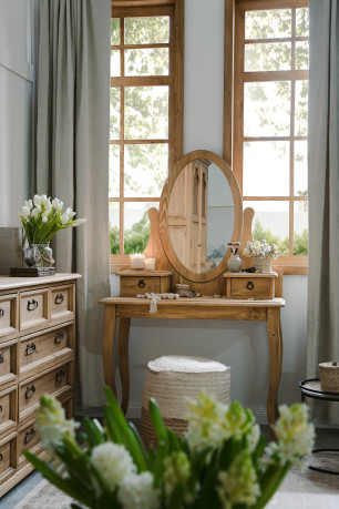 Toaletka wyposażona jest w duże, owalne lustro z możliwością regulacji kąta nachylenia. Posiada również dwie poręczne szufladki na kosmetyki lub drobne akcesoria, umieszczone na tradycyjnych, drewnianych prowadnicach.