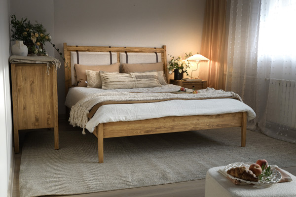 Rama łóżka wykonana jest z litego drewna sosnowego i pokryta naturalnym woskiem pszczelim. To tradycyjny, ekologiczny sposób zabezpieczenia drewna, który podkreśla jego strukturę i ciepłą, naturalną barwę. Woskowana powierzchnia jest gładka, matowa i przyjemna w dotyku, a delikatny zapach drewna tworzy wyjątkowy klimat w sypialni.