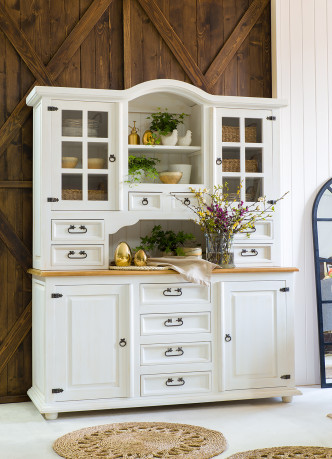 Stylowy kredens wykonany z litego drewna sosnowego, wykończony w kolorze K03 – biała patyna, z subtelnymi przetarciami w stylu rustykalnym. Blat mebla został pokryty naturalnym woskiem pszczelim w odcieniu K01 – jasny wosk (brąz miodowy), co podkreśla charakter drewna i zapewnia mu odpowiednią ochronę.