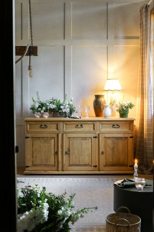 Stylowa komoda trzydrzwiowa z szufladami została wykonana w całości z litego drewna sosnowego. Pokryta naturalnym woskiem pszczelim, należy do mebli ekologicznych. Wosk nie tylko chroni drewno przed wilgocią i uszkodzeniami, ale także subtelnie podkreśla jego strukturę i usłojenie, nadając powierzchni elegancki, matowy efekt.