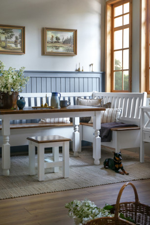 Ławka narożna została wykonana z litego drewna sosnowego i wykończona wyłącznie przy użyciu naturalnych materiałów, takich jak wosk pszczeli. Dostępna jest w kilku wariantach kolorystycznych, w różnych odcieniach wosku. Na życzenie klienta możliwe jest wykonanie mebla w dwóch kontrastujących kolorach – np. siedzisko w innym kolorze niż korpus. Oferujemy również opcję strukturyzacji drewna (+40% do ceny), czyli szczotkowania powierzchni, które podkreśla naturalne słoje i nadaje meblowi wyjątkowego, rustykalnego charakteru.