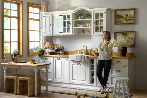 Kuchnia jest malowana na kolor biały z efektem przecierania (biała patyna), co dodaje jej charakteru i nadaje autentyczny, prowansalski wygląd. Idealnie wpisuje się w styl rustykalny i prowansalski, stanowiąc ponadczasowy element każdego wnętrza.