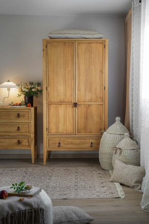 Masywna, lecz wizualnie lekka konstrukcja wykonana z litego drewna sosnowego osadzona została na smukłych, wysokich nóżkach. Dzięki temu mebel prezentuje się subtelnie i nie przytłacza wnętrza, a dodatkowo umożliwia łatwe utrzymanie porządku pod spodem. Połączenie ciepłego wykończenia drewnem, subtelnych zawiasów i stylowych skórzanych uchwytów sprawia, że szafa wyróżnia się nie tylko funkcjonalnością, ale także niebanalnym designem. Jej uniwersalny charakter – z nutką retro – doskonale wpisuje się w aranżacje zarówno klasyczne, jak i nowoczesne.