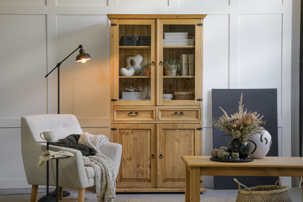 Stylowa witryna wykonana z litej sosny, pokryta naturalnym woskiem pszczelim, co czyni ją meblem w pełni ekologicznym. Powierzchnia wykończona woskiem ma subtelny, lekko satynowy połysk, a sam wosk chroni drewno przed wilgocią oraz drobnymi uszkodzeniami, jednocześnie pięknie eksponując naturalne słoje i strukturę drewna.