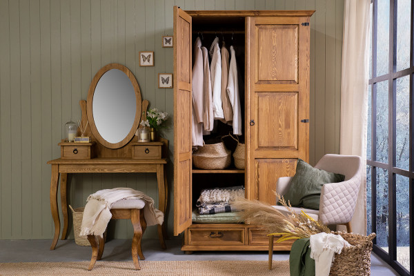 Szafy są pokrywane naturalnym woskiem, który podkreśla strukturę drewna i nadaje powierzchni subtelny połysk. Taki sposób wykończenia zwiększa odporność mebla na codzienne użytkowanie i ułatwia jego pielęgnację.