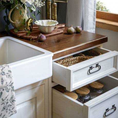 Piękny zestaw mebli kuchennych z litego drewna sosnowego, w oryginalnym odcieniu bieli K03 - biała patyna, z delikatnymi przetarciami na styl prowansalski. Patynowanie mebli oznacza dodawanie im cech dawności i uszlachetnianie drewna za pomocą różnych technik patynowania i nakładania w odpowiedniej kolejności wybranych warstw malarskich. Patynowanie mebla może zupełnie odmienić jego charakter, pomóc dopasować mebel do wybranej stylistyki wnętrz.