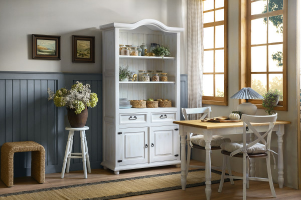 Elementy wykończeniowe, takie jak ręcznie kute uchwyty i zawiasy z metalowym, postarzałym efektem, wprowadzają nutę retro i podkreślają unikalny charakter mebla.