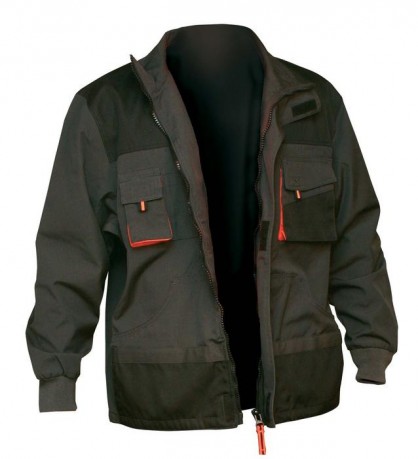 Ubranie Emerton wykonane z materiału 65% poliester / 35% bawełna i poliester 600D (kordura) gramatura: 280g/m2 kolor ciemny szary / wstawki pomarańczowe kolor poliestru 600D: czarny. Bluza posiada 8 kieszeni: dwie duże dolne naszywane kieszenie, na dolnych kieszeniach są dodatkowe kieszenie wykonane w całości z poliestru 600D zamykane na całej długości na rzep, po prawej stronie kieszonka na telefon komórkowy zamykana patką na rzep. Dwie kieszenie na długopisy, duża kieszeń na piersi.