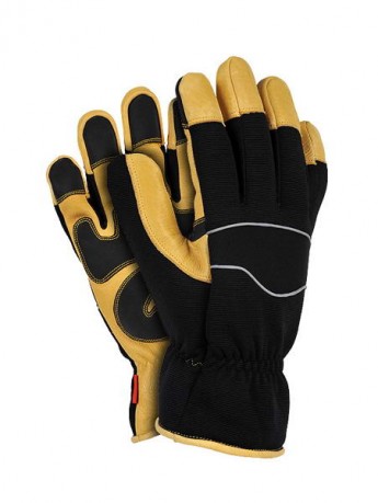 Rękawice ochronne, ocieplane, wykonane z wysokiej jakości skóry świńskiej w jasnym kolorze połączonej z tkaniną.
