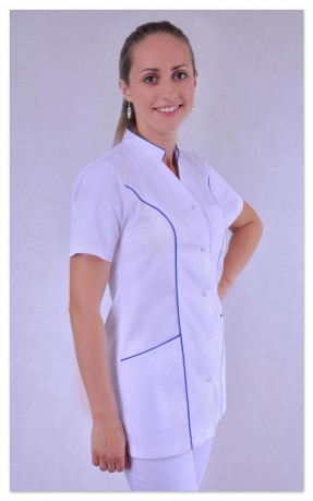 Taliowany żakiet z niepełną stójką. Wypustki z przodu wzdłuż cięć pionowych. Posiada dwie kieszenie dolne wykończone pojedynczą wypustką oraz małą kieszonkę na piersi. Wypustki dostępne w bogatej kolorystyce. Rękaw krótki, 3/4 lub długi. Długość żakietu 74 cm.