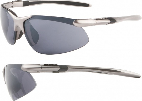 Przeciwsłoneczne okulary sportowe. Wytrzymałe aerodynamiczne oprawki wykonane z poliwęglanu. Trzy pary wymiennych, bezodpryskowych soczewek poliwęglanowych. Filtr UV 400. Powłoka redukująca zaparowanie soczewek. W komplecie czarne etui.
