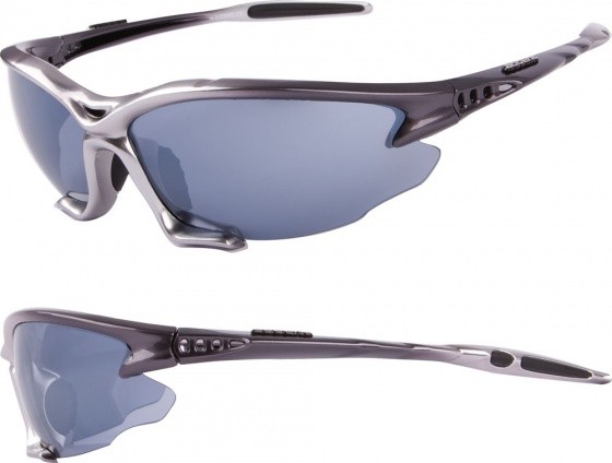 Przeciwsłoneczne okulary sportowe. Wytrzymałe, aerodynamiczne oprawki wykonane z nylonu. Trzy pary wymiennych, bezodpryskowych soczewek poliwęglanowych. Filtr UV 400. Powłoki antyrefleksyjna i redukująca zaparowanie soczewek. Wymienne gumowe noski. W komplecie czarne etui.