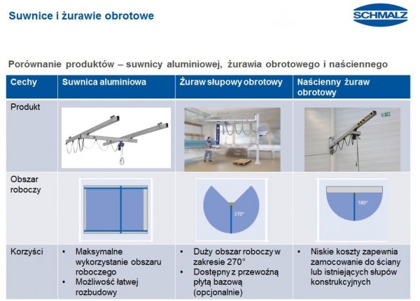 Suwnice aluminiowe umożliwiają obsługę dużej przestrzeni roboczej. Suwnice są zawsze konfigurowane według indywidualnych potrzeb klienta i składane są ze standaryzowanych komponentów. Suwnice można skonfigurować do pracy z obciążeniami sięgającymi 1200 kg.