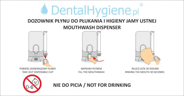 - zawsze łatwy i wygodny dostęp do jednorazowych kubeczków oraz wymiennego płynu, który zapobiega rozwojowi bakterii, wirusów i grzybów, usuwając przy okazji nieprzyjemny zapach z ust, zapewniającego odświeżenie i ochronę antybakteryjną jamy ustnej