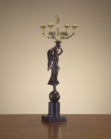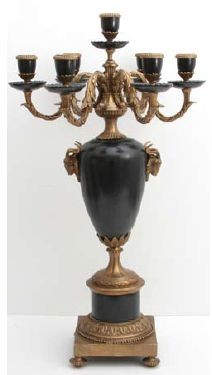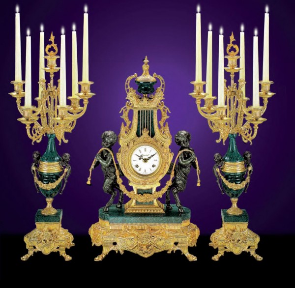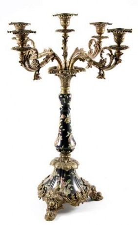 Świecznik- Wykończenie w mosiądzu francuskim(odcień złota bez postarzania), marmur w odcieniu ciemnej zieleni "F", akcenty z brązu, sześć świec, gasidło do gaszenia świec.