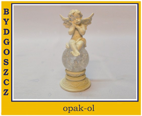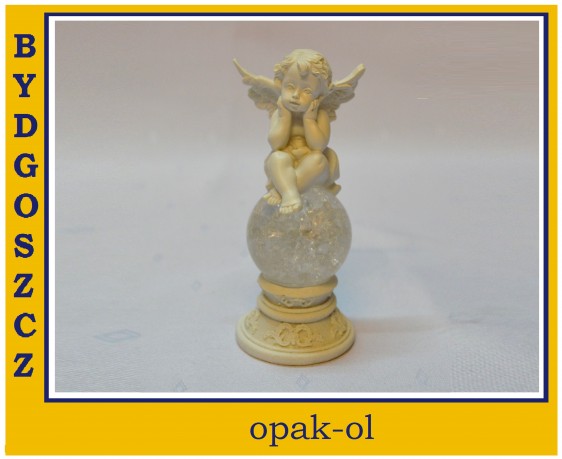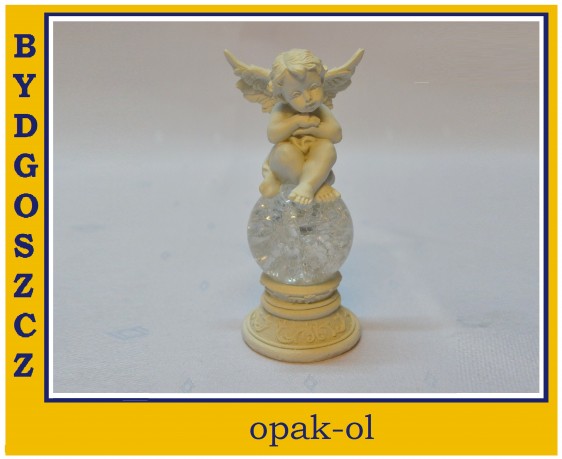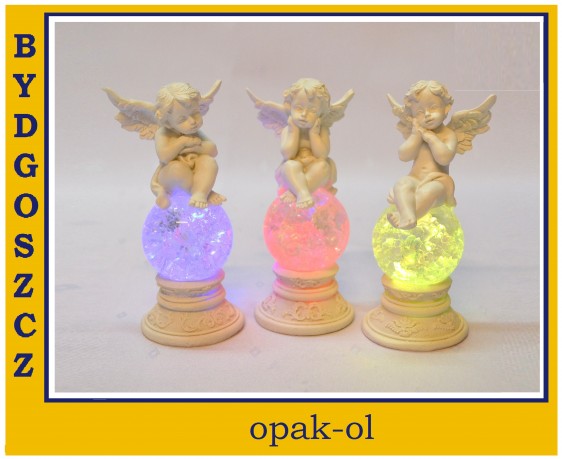 Aniołek wykonany z tworzywa na kuli szklanej z podświetleniem led zmieniającej kolory, wysokość całkowita 14 cm, świetna dekoracja stołów na okoliczność chrztów, narodzin, komunii itp. Produkt wysyłany losowo bez możliwośći wyboru.