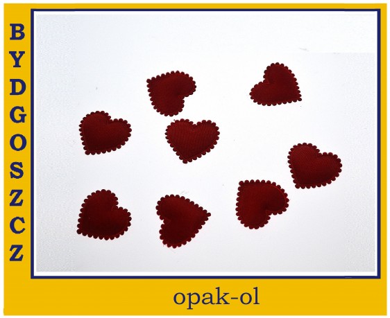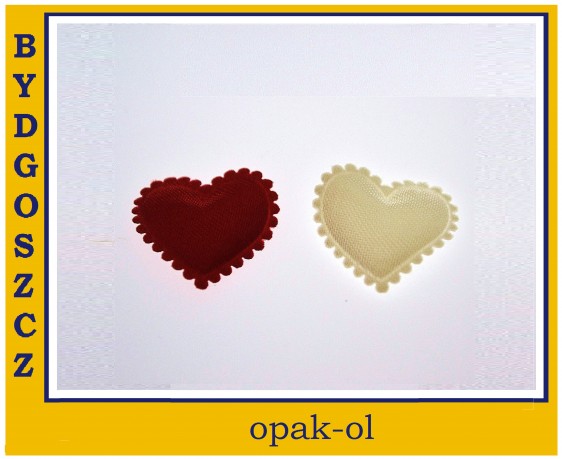 Aplikacja atłasowa w kształcie serduszka, o wymiarach 2 x 2 cm, idealna do dekorowania kartek okolicznościowych, albumów, ramek, itp., opakowanie zawiera 10 sztuk.