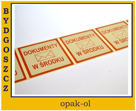 Etykieta, naklejka o wymiarach 10 x 10 cm nawijana na rolce po 100 szt., idealne rozwiązanie do oznaczania produktów i paczek dla firm wysyłkowych, kurierów oraz handlowców, z napisem: DOKUMENTY W ŚRODKU.