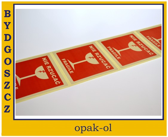 Etykieta, naklejka o wymiarach 10 x 10 cm nawijana na rolce po 100 szt., idealne rozwiązanie do oznaczania produktów i paczek dla firm wysyłkowych, kurierów oraz handlowców, z napisem: NIE RZUCAĆ. FRAGILE.