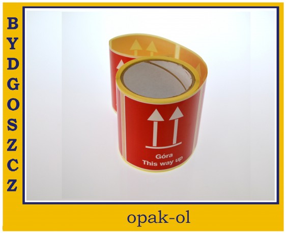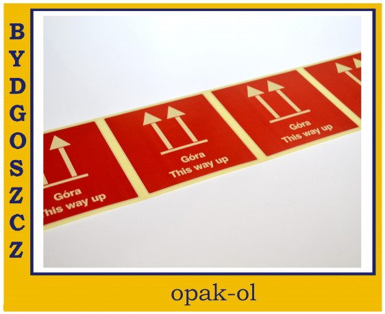 Etykieta, naklejka o wymiarach 10 x 10 cm nawijana na rolce po 100 szt., idealne rozwiązanie do oznaczania produktów i paczek dla firm wysyłkowych, kurierów oraz handlowców, z napisem: GÓRA. THIS WAY UP.
