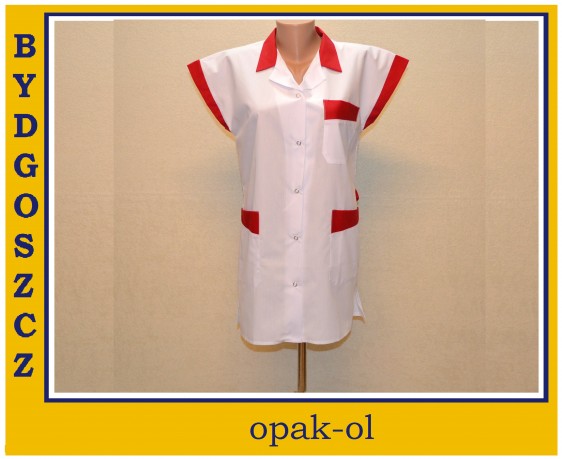 Fartuch dostępny w kolorze białym z dodatkami w trzech kolorach: blękitnym, czerwonym lub zielonym.