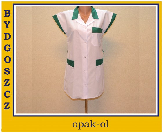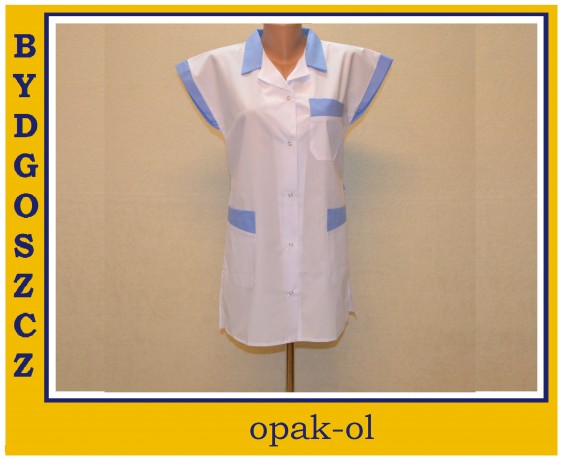 Fartuch medyczny typu kimono, wiązany z tyłu, wykonany z elanobawełny koszulowej o gramaturze 120g/m2, zapinany na napy, z krótkim rękawem, ładnie dopasowany.