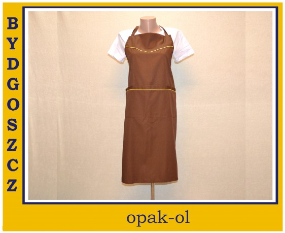 Fartuch typu przedniak, wykonany z elanobawełny o gramaturze 175 g/m2, posiada regulację wysokości na pasku, z doszywaną kieszenią przednią, przeszytą w dwóch miejscach, co tworzy trzy poręczne kieszonki, w górnej części fartucha miejsce na haft lub nadruk, rozmiar uniwersalny. Dostępny w kolorze brązowym z żółtymi wypustkami.