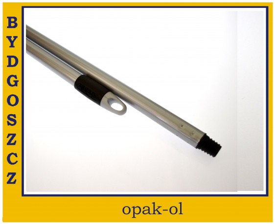 Wysokiej jakości kij aluminiowy chromowany, lekki o długości około 130 cm zakończony z jednej strony uchwytem do zawieszania a z drugiej gwintem pasującym do wszystkich standardowych mopów i mioteł.