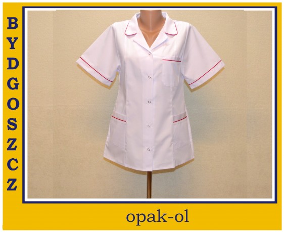 Fartuch bluza kucharska, gastronomiczna, damska, wykonana z elanobawełny o gramaturze 175g/m2, z krótkim rękawem, w kolorze białym, przy kołnierzu, rękawach i kieszeniach wykończona czerwonymi wypustkami, zapinana na napy, ładnie dopasowany krój.