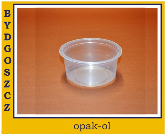 Pojemnik garmażeryjny, okrągły, o średnicy 10,5 cm i wysokości 5,5 cm, z tworzywa przeźroczystego, atestowany. Stosowany jako opakowanie do wyrobów garmażeryjnych, własnych itp.