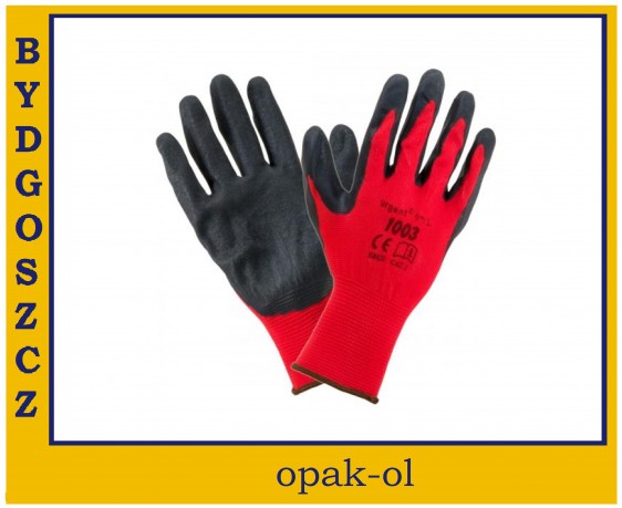 Rękawice robocze URGENT wykonane z poliestru powlekane od wewnętrznej części powłoką latexu. Kategoria ochrony: CE I Norma EN 420.