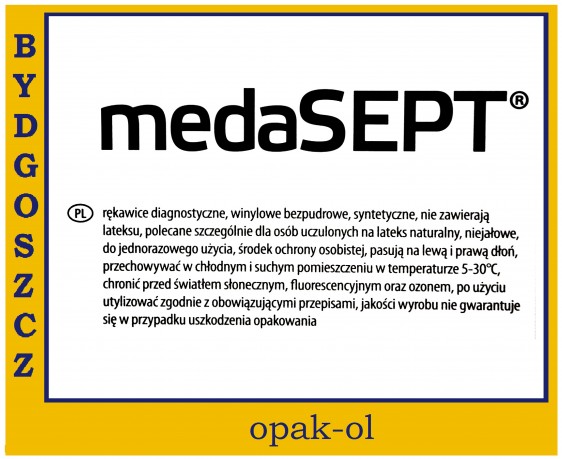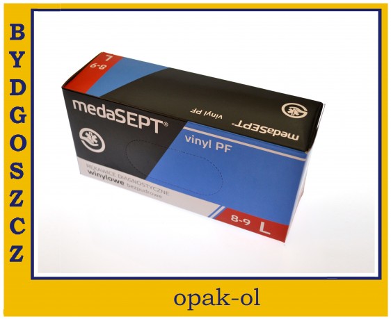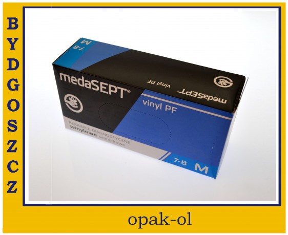 Rękawice winylowe MEDA SEPT PF, diagnostyczne, bezpudrowe, syntetyczne, nie zawierają lateksu, do jednorazowego użycia, pasują na lewą i prawą dłoń, zapakowane w kartonik po 100 szt., kolor biały.