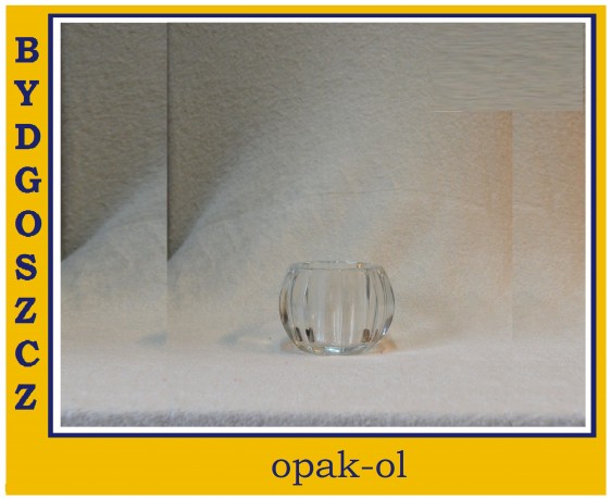 Świecznik wykonany z masywnego szkła o wysokośći 6,5 cm i średnicy zewnętrznej mierzonej w środku naczynia 8 cm, na tilighta o średnicy do 3,8 mm.