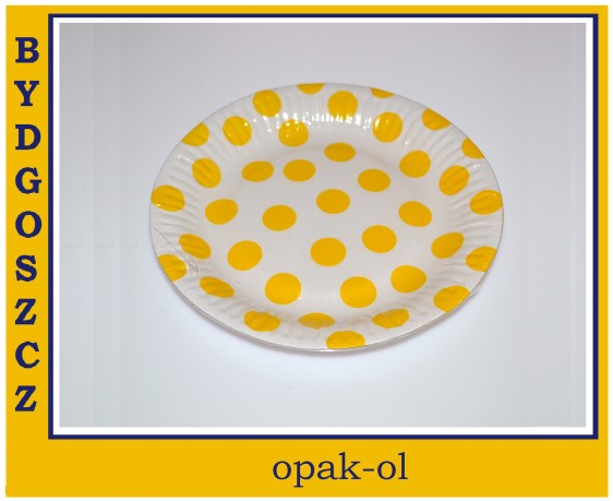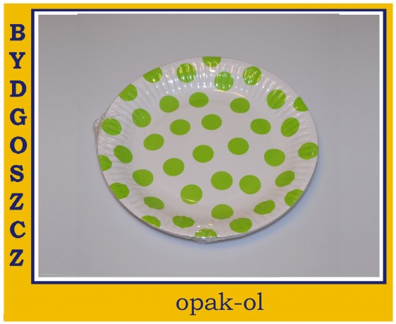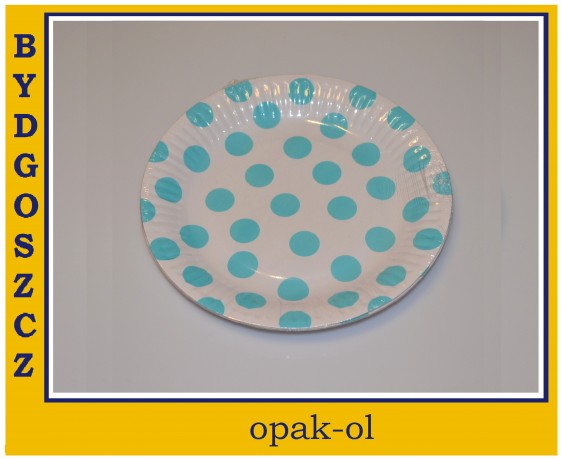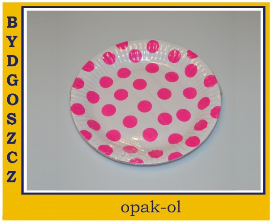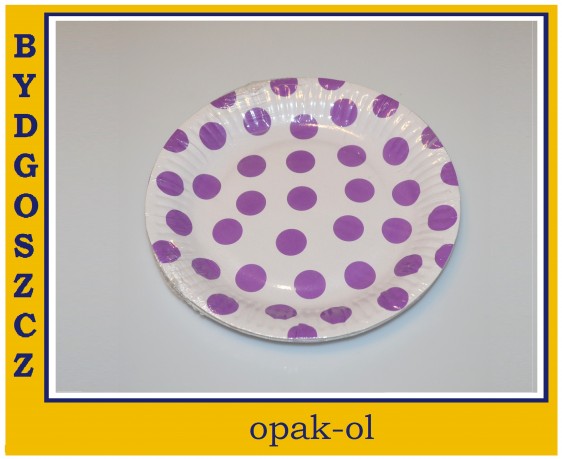 Talerz o średnicy 18 cm papierowy z nadrukiem w groszki, z atestem . Dostępne także kubeczki i balony z tym samym nadrukiem.