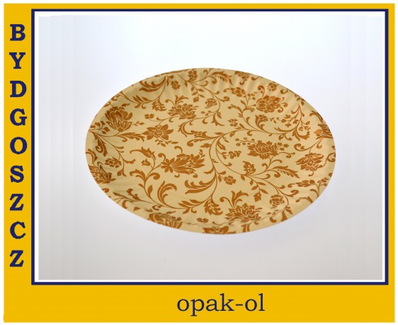Talerz papierowy o średnicy 23 cm, z nadrukiem złote kwiaty, niedzielony, jednorazowy, niezastąpiony na imprezach plenerowych, grillach, piknikach itp. Posiada atest PZH.
