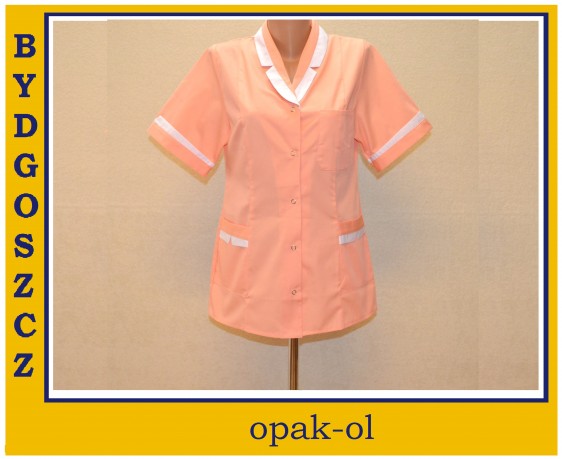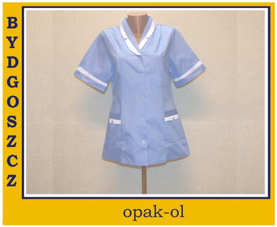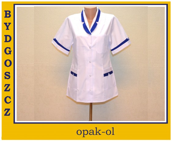 Żakiet, fartuch medyczny dla pielęgniarki, lekarki, wykonany z elanobawełny o gramaturze 175g/m2, zapinany na napy, z krótkim rękawem, przy kołnierzu, rękawach i kieszeniach wykończony dekoracyjnymi wstawkami, ładnie dopasowany.