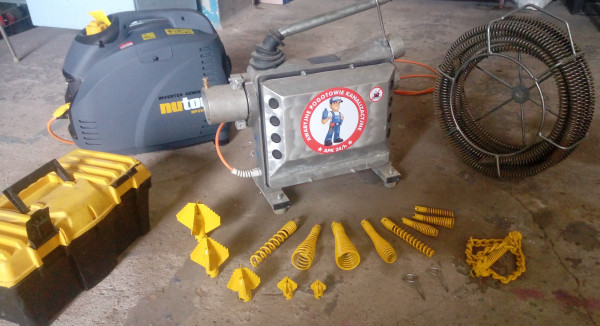 Udrażniamy elektromechanicznie i czyścimy rury maszyną RAK. Metoda ta polega na wprowadzeniu do kanalizacji spirali czyszczącej napędzanej mechanicznie, na końcu której znajdują się odpowiednie końcówki typu frez lub łańcuch w zależności od średnicy i zanieczyszczenia rur.