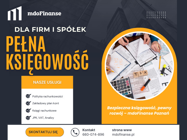 Sposób wykonania: Usługa realizowana jest stacjonarnie w biurze mdoFinanse w Poznaniu lub zdalnie – poprzez bezpieczny system wymiany dokumentów online. Klient ma stały dostęp do swoich danych finansowych.