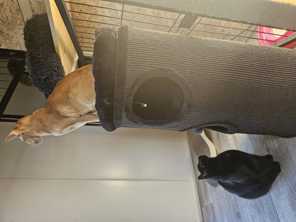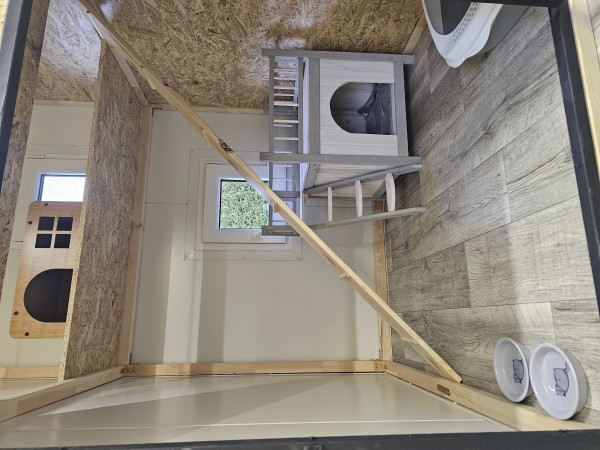 W pełni wyposażony pokoik dla jednego albo dwóch kotów. Cena zawiera opiekę, kuwety, żwirek, dostęp do części wspólnej z drapakami, zabawkami, półeczkami, kanapą.
