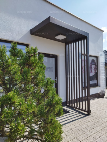 Stalowy daszek nad drzwi wejściowe premium.Dowolna kolorystyka z palety RAL. Produkt na zamówienie. Możliwość spersonalizowania wymiarów po wcześniejszym uzgodnieniu. Możliwość zamontowania oświetlenie - dodatkowo płatne.