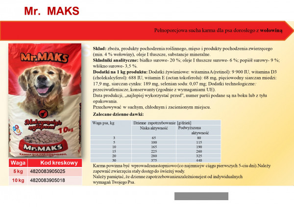 Mr. MAKS Pełnoporcjowa sucha karma dla psa dorosłego z wołowiną: Skład: zboża, produkty pochodzenia roślinnego, mięso i produkty pochodzenia zwierzęcego