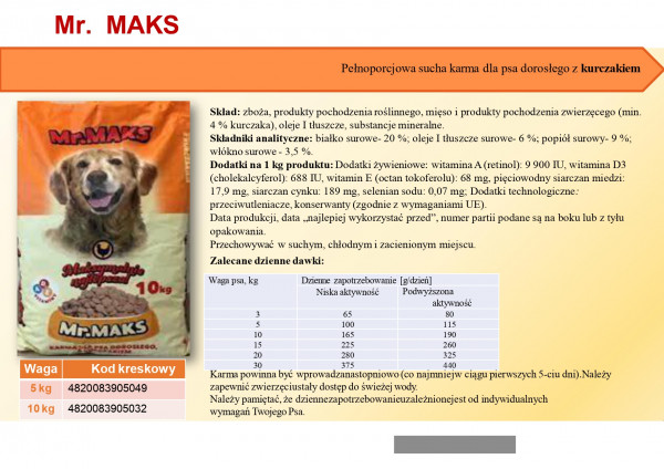 Mr. MAKS Pełnoporcjowa sucha karma dla psa dorosłego z kurczakiem: Skład: zboża, produkty pochodzenia roślinnego, mięso i produkty pochodzenia zwierzęcego (min.