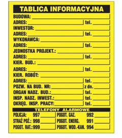 Tablica została zaprojektowana i wykonana tak aby zawierała wszystkie dane określone w rozdziale 3 rozporządzenia Ministra Infrastruktury z dnia 26.06.2002 r. w sprawie dziennika budowy, montażu i rozbiórki, tablicy informacyjnej oraz ogłoszenia zawierającego dane dotyczące bezpieczeństwa pracy i ochrony zdrowia (Dz. U. z 2002 r. Nr 108, poz. 953)