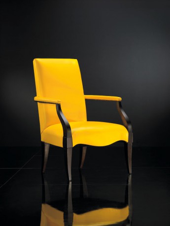 Elegancki fotel z drewna bukowego. W pełni tapicerowany. Wykończenie tapicerki postarzanymi gwoźdźmi. Dostępny w wielu wariantach kolorystycznych.