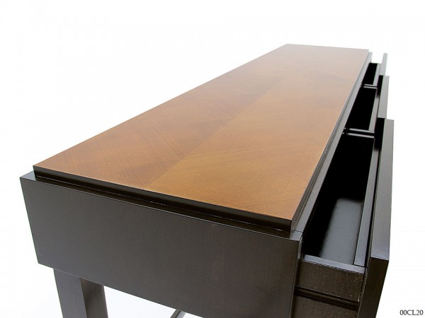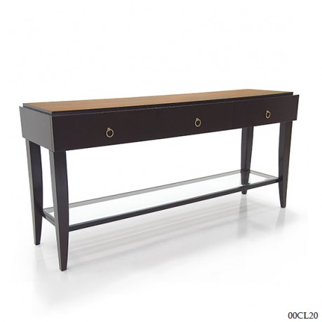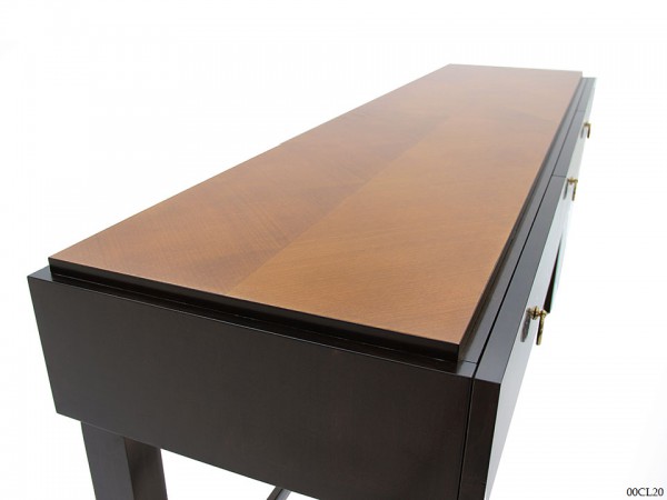 Elegancka konsola drewniana. Wysoki blat z trzema szufladami ze złotymi uchwytami. Konstrukcja z drewna bukowego.