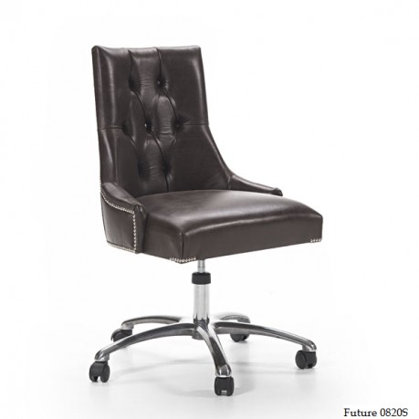 Elegancki krzesło biurowe o obrotowej konstrukcji. Materiał tapicerki wedle zamówienia klienta (na zdjęciu - skóra). Tapicerka wykończona srebrnymi gwoźdźmi.