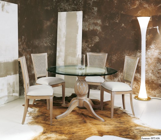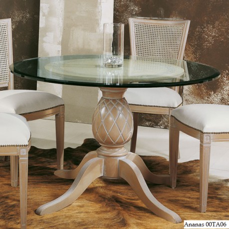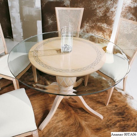 Okrągły, szklany stół z bazą z drewna bukowego. Wyjątkowy i elegancki design.