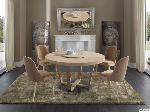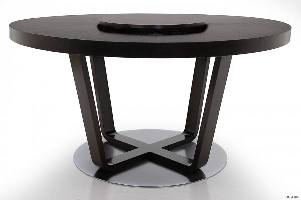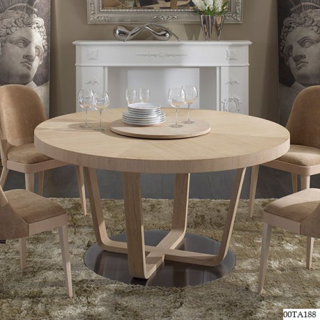 Nowoczesny, okrągły stół dębowy z podwyższeniem po środku blatu i chromowaną podstawą.