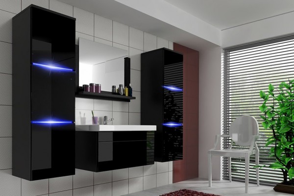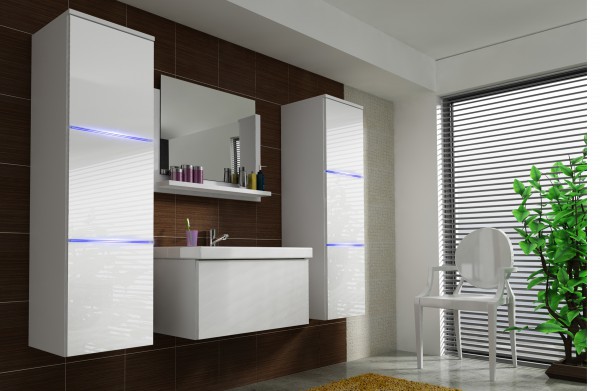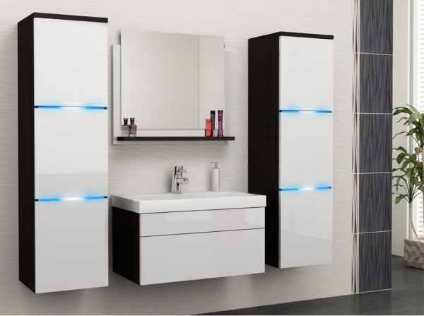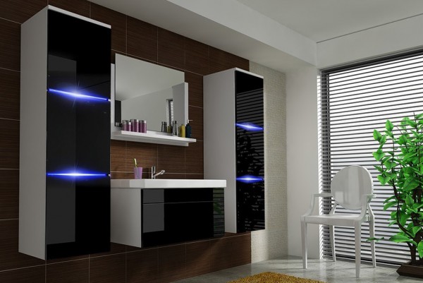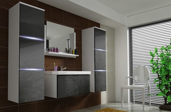 Łazienka LAGUNA to połączenie frontów w wysokim połysku z matowymi korpusami co podkreśla awangardową linię mebla.
